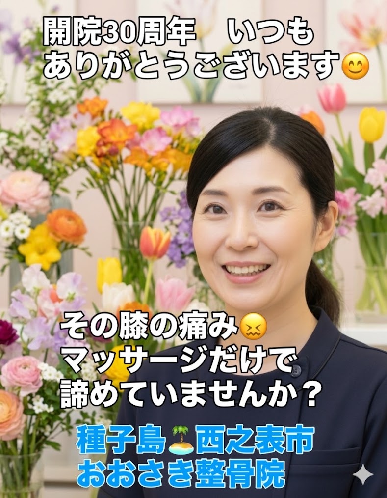 【ハッシュタグ】 #西之表市 #種子島 #おおさき整骨院 #30周年 #整骨院 #膝の痛み #変形性膝関節症 #ショックウェーブ #体外衝撃波 #鹿児島整骨院 #膝痛改善 #健康長寿 #一生自分の足で歩こう #膝の悩み解消